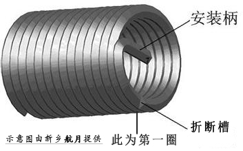 首先把钢丝螺套拿在手中,使有安装柄的一头向上,从有折断槽的位置向下数,与折断槽对应的下面这一圈算第一圈,这样一直向下数第二圈、第三圈……当数到钢丝螺套最末瑞时,如果正好与折断槽的相对应位置是圈的终了,这样数下来是整数圈。如果还会多出一些,这样就会产生不是整数圈的情况,看看多出多少,做一个分数估计,看看是几分之几圈,这样数下来的圈数会是一个带小数的圈数。