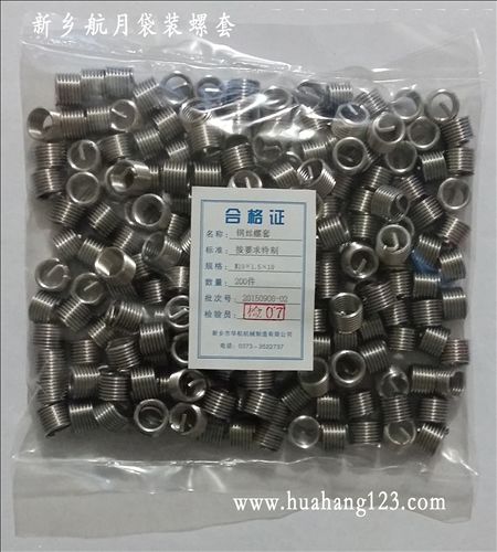 钢丝螺套生产完成,检验合格后,将其装入塑料袋中,并在袋外粘上(或袋内装上)产品质量合格证,合格证上的内容应包括: