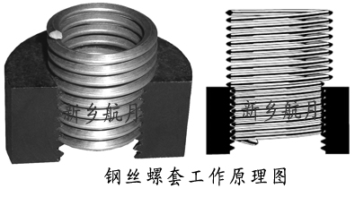 自由状态的钢丝螺套直径比其欲装入的钢丝螺套专用螺纹底孔直径大,装配时使钢丝螺套经过安装扳手螺纹引导圈受扭力,从而使其直径变小,旋入钢丝螺套专用螺纹底孔中。安装完成后,钢丝螺套有一种要回复自由状态下大直径的趋势,从而产生向四周胀紧的作用,使其牢固地固定在螺纹底孔内,形成可靠的内螺纹,绝不会随螺钉的旋动而转动。